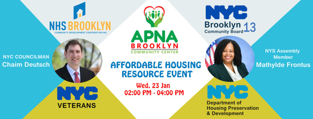 Join us on Wed., Jan. 23 from 2-4pm at APNA’s new facility to learn how to apply for affordable housing lotteries; new affordable units to in Coney Island that will give preference to local residents, veterans, and seniors; tenants rights education; financial coaching; and more!