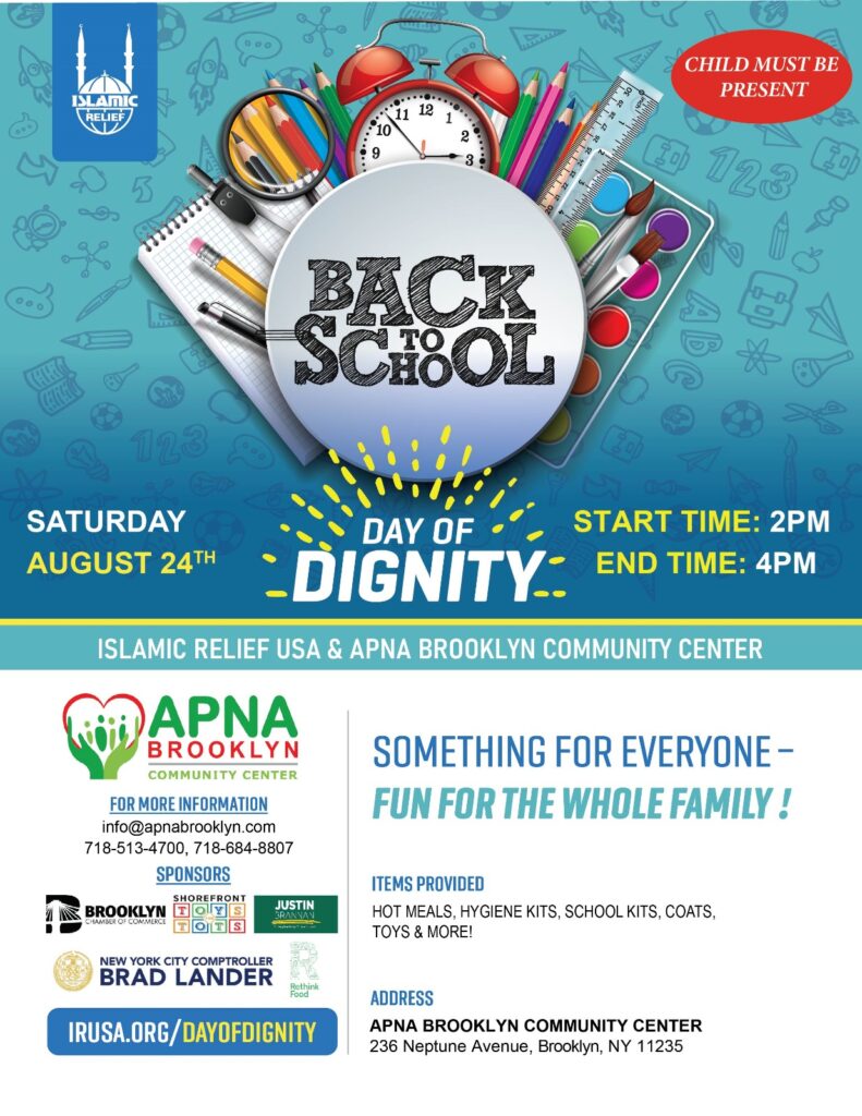 🎒📚 Get ready for the school year with APNA Brooklyn Community Center’s Back to School – Day of Dignity events! Join us on August 24th and August 29th for a day filled with essential school supplies, hygiene kits, coats, and more for the whole family. 🧡