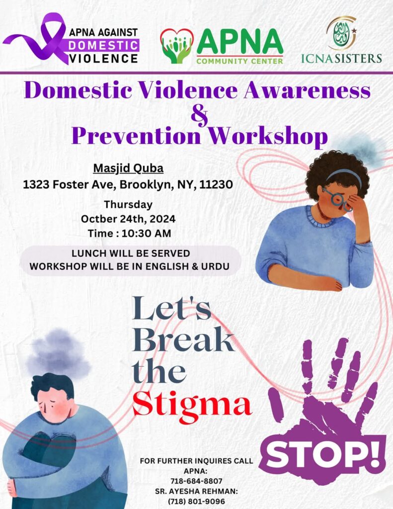 Join us for an important Domestic Violence Awareness & Prevention Workshop on Thursday, October 24th at 10:30 AM at Masjid Quba (1323 Foster Ave, Brooklyn). Letโs come together to support survivors, raise awareness, and learn how we can stop domestic violence in our communities in partnership with @icnasistersusa